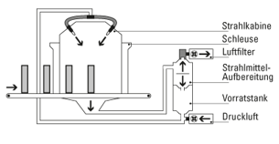 Alle automatisierten Systeme werden unter Anwendung modernster Technologie und Konstruktion produziert, um Strahlen, Strahlmittelaufbereitung und Staubabscheidung in einem vollständig geschlossenen Kreislaufsystem zu ermöglichen.